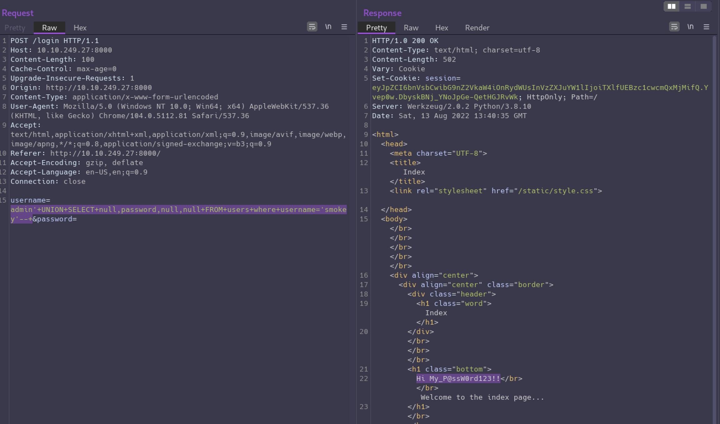 That name smokey is likely coming from the same database query that runs during the authentication process, so we can try leaking data with a UNION SQLi attack.