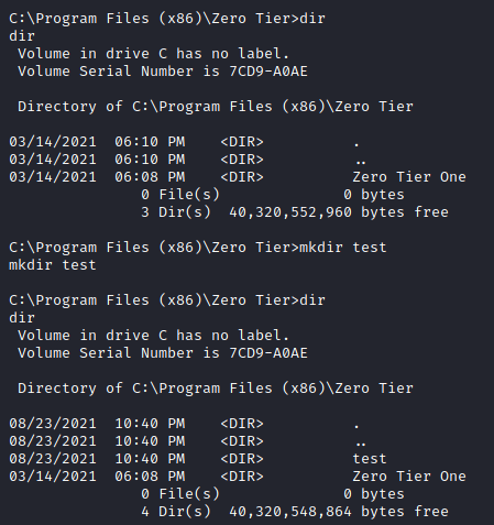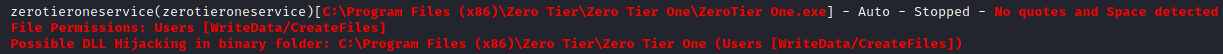 The second one is much better, and Iβm able to control the zerotieroneservice service as well as write files to the C:\Program Files (x86)\Zero Tier directory. As noted the file path suffers from a unquoted service path vulnerability.