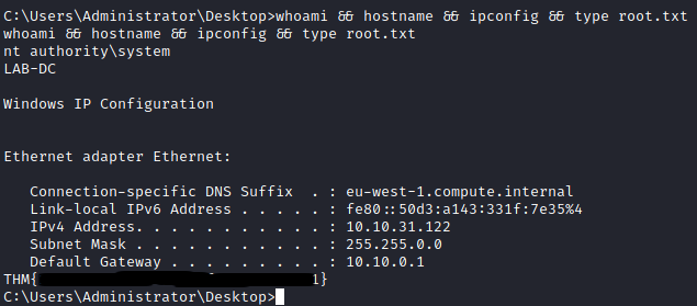 The first thing I do is get a meterpreter shell back to my Kali box. I prefer working on that terminal, instead of through RDP.