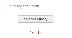 The page requested a message to send to Yash and echoed it back to me. I played with the message for a while, trying to send commands to the server. From what the page returned me, it was clear that many things were stripped out from the message I sent.