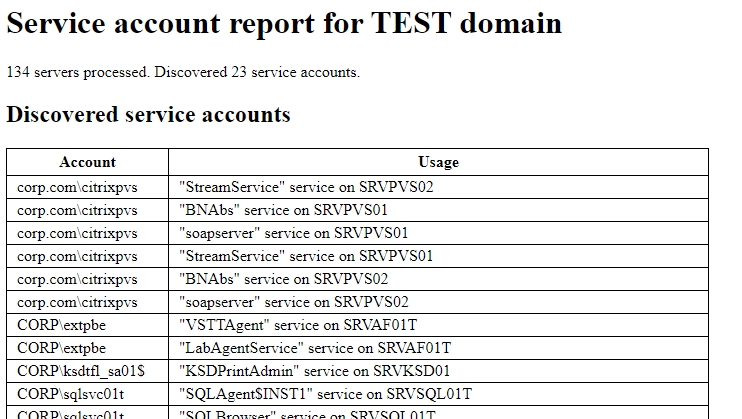 The script gather the servers list from Active Directory, and tries to retrieve from the server all information related to services and users used to run them.