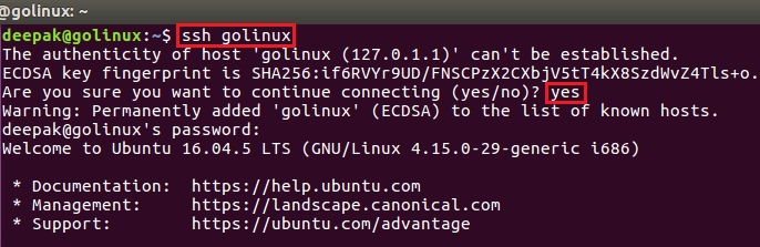 When you try to connect for the first time, it asks for continuing the connection. Type yes and press Enter. Then it asks you to enter the password, which you will use later to log in to the remote machine.