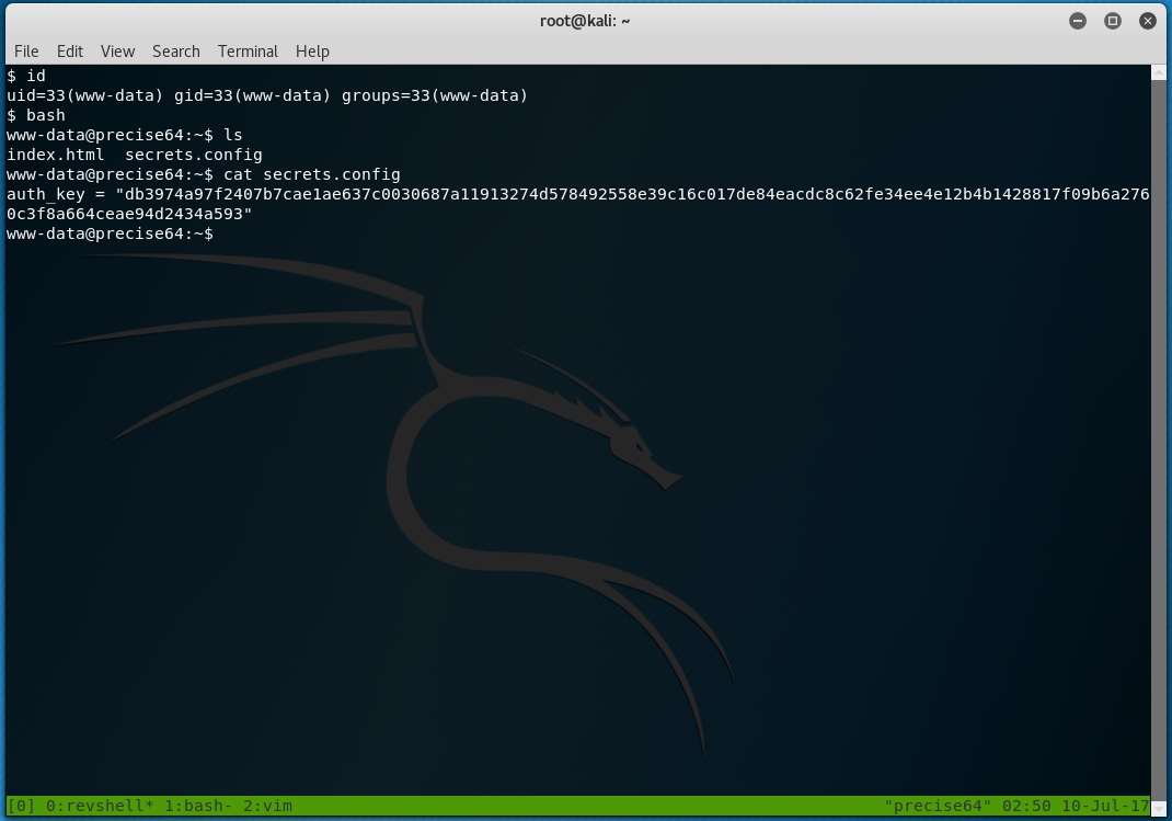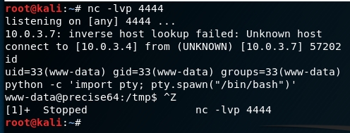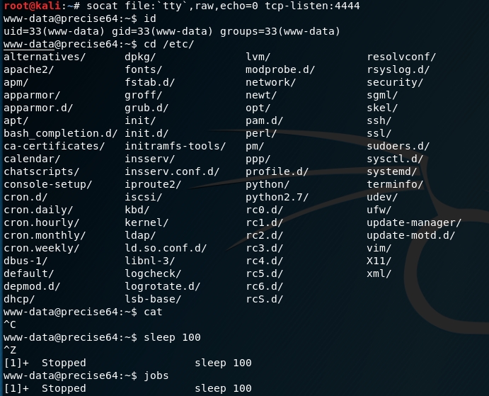 On Kali, youโll catch a fully interactive TTY session. It supports tab-completion, SIGINT/SIGSTP support, vim, up arrow history, etc. Itโs a full terminal. Pretty sweet.