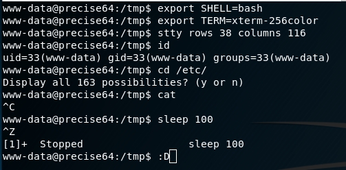 While the shell is in the background, now examine the current terminal and STTY info so we can force the connected shell to match it:
