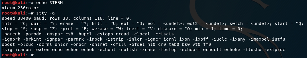 After the reset the shell should look normal again. The last step is to set the shell, terminal type and stty size to match our current Kali window (from the info gathered above)