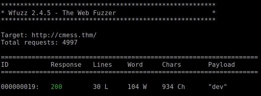 wfuzz -c -f subdomains.txt -w /usr/share/seclists/Discovery/DNS/subdomains-top1million-5000.txt -u βhttp://cmess.thm/" -H βHost: FUZZ.cmess.thmβ --hl 107