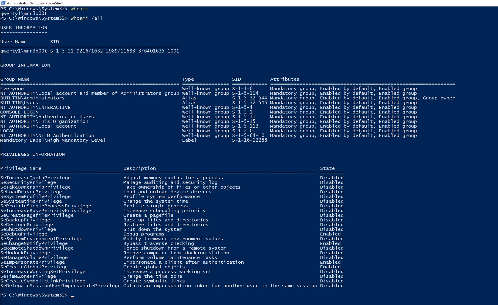 And just to be clear, a medium integrity process as an administrator user will have the following privileges:
